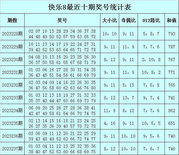 福彩快乐8第2023237期开奖回顾:01 03 04 11 12 13 25 32 35 36 38 40 47 52 53 60 66 68 69 75,其中奖号奇偶比开出10:10,大小比开出8:12,012路比开出7:6:7,和值为740,跨度为74。
