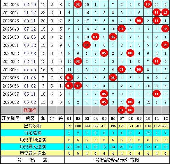 在历史同期奖号中,后区奖号跨度尾数大小比为10:6(定义:跨度1、2、3、10、11为小尾跨度,跨度4、5、6、7、8、9为大尾跨度),其中小尾跨度出现次数较低,本期注意小尾跨度回补,关注跨度1。
