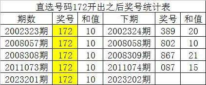 从以上统计可以看出,直选号码172出现之后,其下期奖号:1。下期偶数号码出现概率100%;2。下期大号出现概率100%;3。下期0路号码出现概率100%;4。下期全质全合组合没有出现;