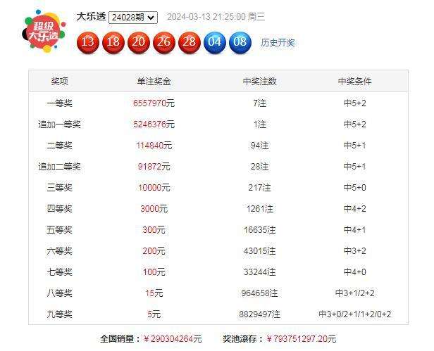 大乐透第24028期开奖。当期开奖号码为:前区13 18 20 26 28,后区04 08。当期前区号码大小比为4:1,奇偶比为1:4,三区比0:3:2;前区开出1组同尾号18 28;2枚隔码18 26;后区开出小大组合04 08。