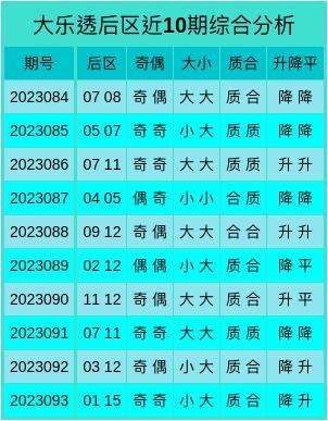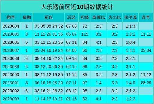 上期回顾:大乐透第23093期开出奖号:前区11 14 17 19 21,后区01 05,其中前区和值为82,跨度10,大小比为2:3,后区开出小小、奇奇数号码,和值为6,跨度为4。