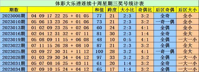 前区大小比推荐:最近10周星期三前区大小奖号总比例为18:32,其中有2期大号热出,有8期小号热出,小号表现比较活跃,最近3周星期三奖号大小比分别为3:2、1:4、1:4,本周星期三注意大号热出,看好大小比3:2。