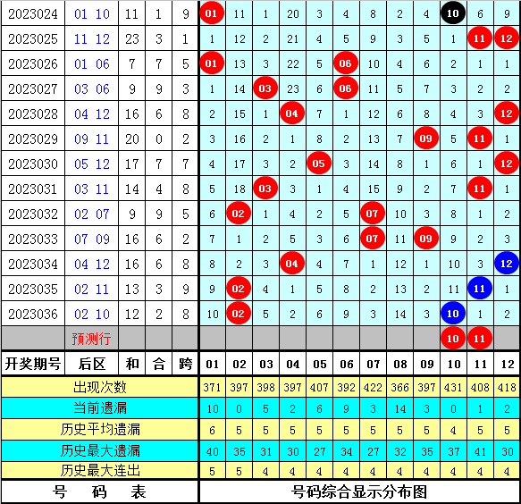 后区分析:最近10周星期三后区号码奇偶比为8:12,偶数开出频次较高,号码大小比为10:10,大小号码开出比例基本持平,本期后区精选两码10和11。