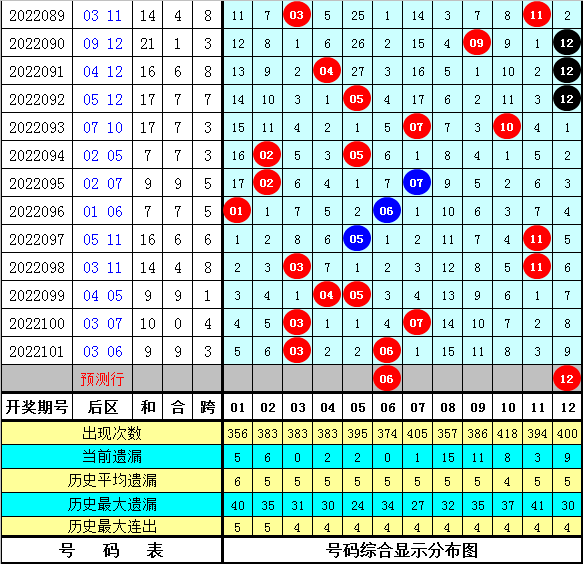 后区第二位:上期开出号码06,遗漏值是4,为热码,最近10期该位号码遗漏值分别为:0期、11期、1期、1期、7期、7期、0期、1期、4期、4期,其中号码冷温热个数比为0:3:7,热码开出7个,出现比例较高。