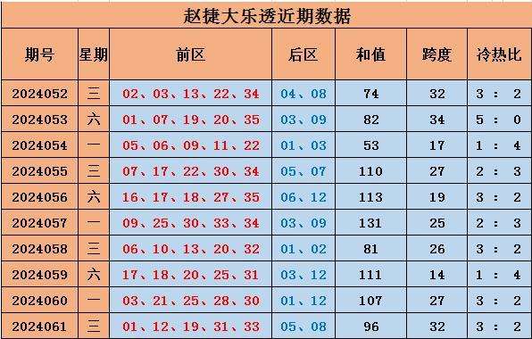 062期赵捷大乐透预测奖号:和值跨度冷热比分析