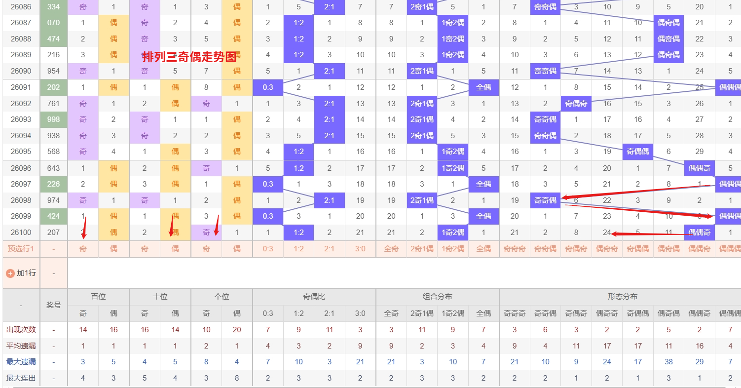 排列三 奇偶分析:从上图可以看出排列三100期内百位奇偶比约为52比48,十位奇偶比为51比49,个位奇偶比为54比46,十位的比值比较均衡,但是个位的比值偏差就有点大,历史奇偶形态近2期开出偶偶奇后下一期的走势为,第002期开出偶偶奇后003期开奇偶偶, 第015期开出偶偶奇后第016期开偶奇奇,第033期开出偶偶奇后第034期开奇偶奇,近期排列三奇偶走势中,偶奇奇和奇偶偶两种形态已持续遗漏较长时间,形成了明显的冷号堆积,从奇偶形态的长期轮动规律来看,任何冷态组合在超出平均遗漏周期后,都会面临越来越大的回补压力,尤其是当整体奇偶分布不再被单一的全奇或全偶形态主导,而是进入混合形态交替震荡的阶段时,冷态组合的补位概率会显著提升。具体而言,偶奇奇对应百位偶数、十位奇数、个位奇数的结构,这种组合在近期奇数整体偏活跃的背景下反而被长期忽略,一旦偶数在百位获得突破口,而十位和个位的奇数热度尚未完全消退,所以排列三2026101期奇偶形态推偶奇奇与奇偶偶。本文由彩虹多多钱是生命动力所著,请勿转载