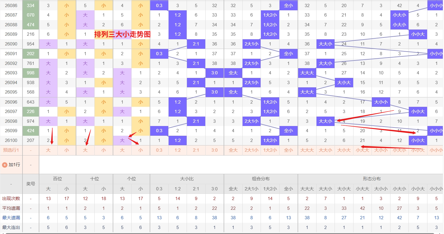 排列三 大小形态分析:从大小走势图上可以看出排列三100期内百位大小比约为47比53,十位大小比约为46:54,个位大小比约为55比45,除了个位奇数比偶数多,十位和百位偶数比奇数多。历史数据近2期开出小小大下一期的走势为,第007期开小小大后第008期开大小大。第012期开出小小大后第013期开大小小,第036期开出小小大后037期开小大大。近期排列三大小走势中,大小大形态已持续遗漏较长时间,形成明显的冷号积累,从大小形态的轮动规律来看,极端冷态往往伴随着一次技术性回补,尤其是当整体大小分布不再由全大或全小主导,而是进入大小交替震荡的阶段,大小大作为典型的两端大、中间小结构,在百位和个位大号回暖、十位小号保持活跃的背景下,触发回补的概率正在逐步上升。与此同时,大小小形态作为当前的中温组合,既未像大小大那样长期缺失,也没有出现过热透支的迹象,所以排列三第2026101期大小形态推荐大小大防大小小。本文由彩虹多多钱是生命动力所著,请勿转载