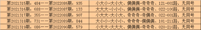 在排列三历史开奖中,第2021315期-第2021319期连续5期奖号为:484-688-355-731-086。