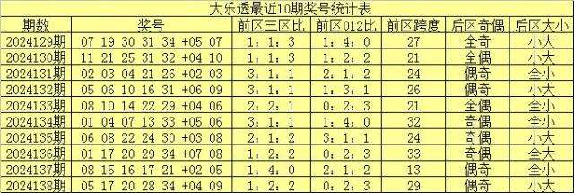 大乐透第2024138期奖号开出:05 17 20 28 34 +04 09。其中前区三区比为1:2:2,012路比为0:2:3,后区开出一大一小、一奇一偶奖号。