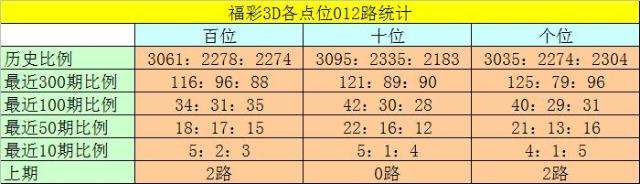 个位分析:该位最近10期开出了4个0路号码、1个1路号码、5个2路号码,2路号码热出,1路号码走冷。本期排除2路号码,参考号码:3。