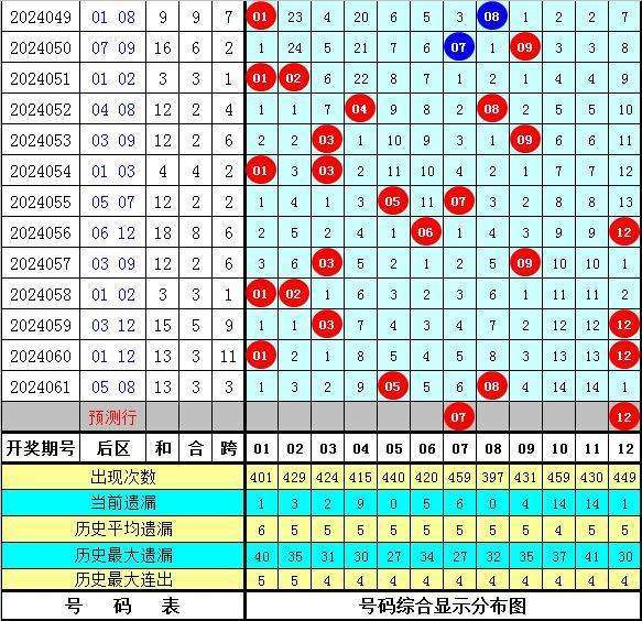 6、在历史同期第062期开奖中,后区全大组合出现6次,全小组合出现2次,一大一小组合出现9次,本期看好后区开出全大组合,参考号码07、08、09、12。