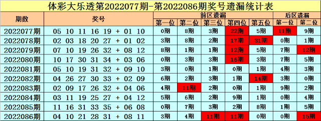 王朝天大乐透第2022087期奖号冷温热码分析:(遗漏0-3期奖号为热码,遗漏4-9期奖号为温码,遗漏10期及以上奖号为冷码)