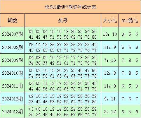 快乐8第2024013期奖号为:03 08 10 12 14 20 24 25 28 29 30 34 45 49 53 56 57 65 74 77,其中奖号012路比为6:5:9,大小比为8:12。