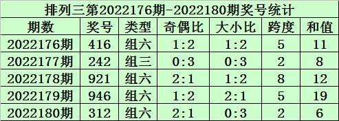 上期回顾:排列三第2022180期开奖号码为312。奖号类型为组六,奇偶比为2:1,大小比为0:3,跨度为2,和值为6。