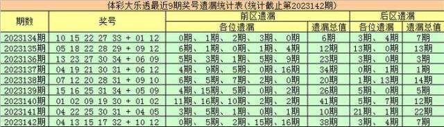 上期回顾:体彩大乐透第2023142期开出奖号为:04 13 15 17 32 + 10 12,其中前区各位奖号分别遗漏:0期、5期、2期、15期和16期,遗漏总值为38期,后区号码分别遗漏3期和4期,遗漏总值为7期。