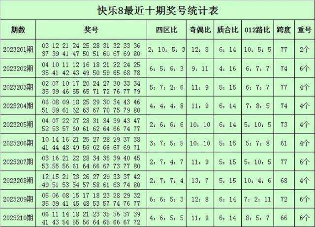 福彩快乐8第2023210期开奖回顾:06 11 14 18 21 23 35 36 37 39 41 43 54 55 56 64 65 66 67 72,其中奖号四区比为4:6:5:5,奇偶比为11:9,质合比为6:14,跨度为66,012路比为8:5:7,开出6个重号:06、18、23、35、39、41。