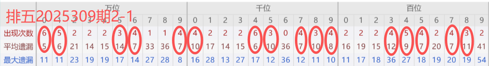 下图所圈出的为近30期各位置所出现的热码出现次数及平均遗漏值,用以参考和一些冷码组合选号。