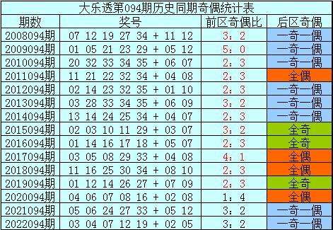后区分析:在第094期历史同期开奖中,后区奖号奇偶比为14:16,最近5年同期后区奇偶走势为:全偶、全奇、全偶、一奇一偶、一奇一偶,今年同期看好偶数号码大热,关注号码06、12。