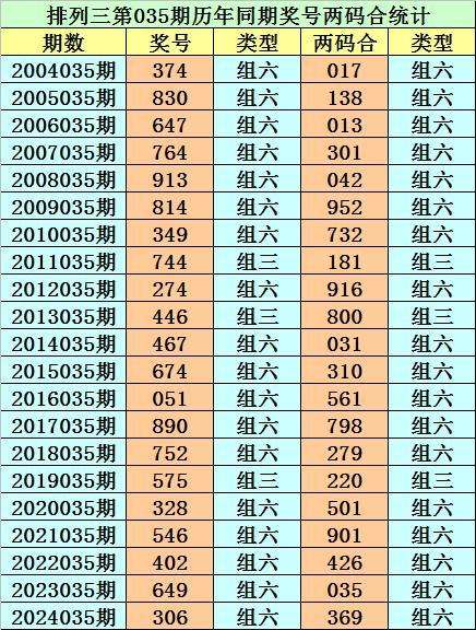 在历年同期中两码合开出年限分别为:0、1出现11年,3出现8年,2、9出现6年,5、6、7、8出现4年,4出现2年,第2025035期预计两码合出现:3、5、8。