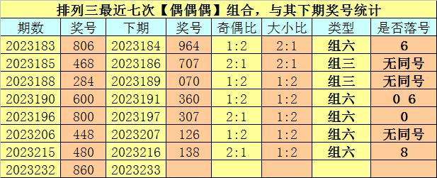 奇偶分析:排列三上期奖号为860,其奇偶类型为【偶偶偶】,最近七次出现奇偶类型偶偶偶的号码分别为:806、468、284、600、800、448、480,其下期奖号分别为:806、468、284、600、800、448、480。其中号码奇偶比为10:11,奇偶奖号开出比例基本相当,本期奇数热出的可能性较大,预计出现2个奇数号码。