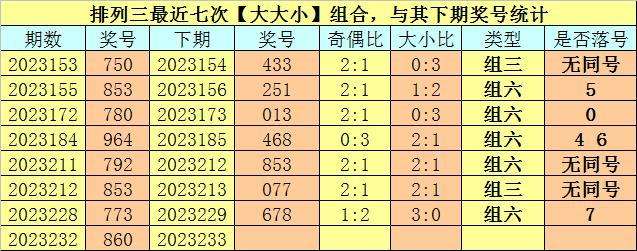 大小分析:排列三上期开出号码860,大小类型为【大大小】,最近七次开出大小类型大大小的奖号分别为:750、853、780、964、792、853、773,其下期分别开出号码:433、251、013、468、853、077、678。其中号码大小比为10:11,大小号码出现次数基本相当,本期注意大号转热,看好出现2个大号。
