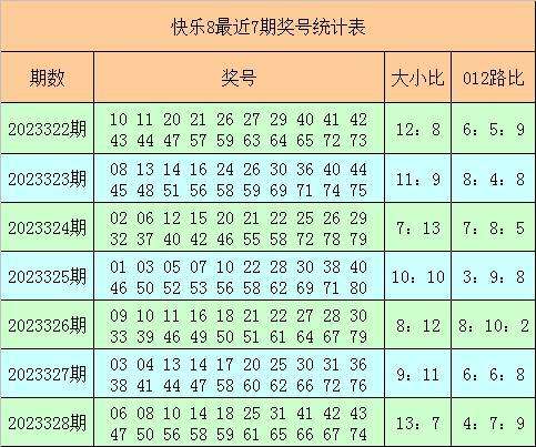 快乐8第2023328期奖号为:06 08 10 14 18 25 31 41 42 43 47 50 56 58 59 61 65 66 67 74,其中奖号012路比为4:7:9,大小比为13:7。