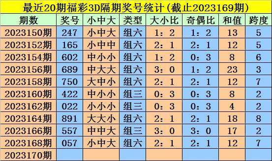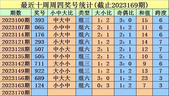 奖号类型判断:近期周四组六开出较少,上周四为组六,组三出现较多,本周四重点关注组六号码。