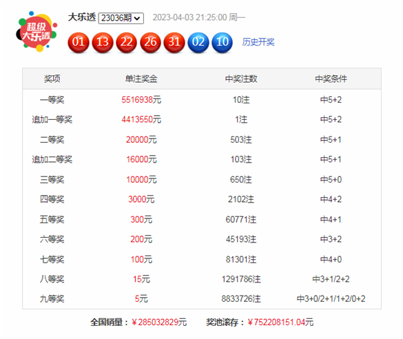 大乐透第2023036期开出奖号为:01、13、22、26、31+02、10。其中前区奇偶比为3:2,三区比为1:2:2,大小比为3:2,后区开出全偶组合。
