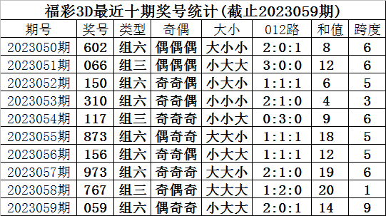 开奖回顾:福彩3D第2023059期奖号为059,奖号形态为:组六、小大大、2:0:1、偶奇奇。