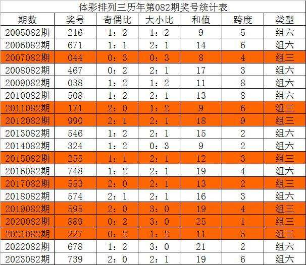 体彩排列三历年第082期开出奖号分别为:216、671、044、467、038、508、171、990、546、324、255、748、553、574、595、889、227、678、739。统计详见下表: