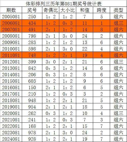 在历年排列三第082期开奖中:组三号码出现8次,组六号码出现11次。组三、组六号码出现比例持平,本期奖号形态关注:组六号码。