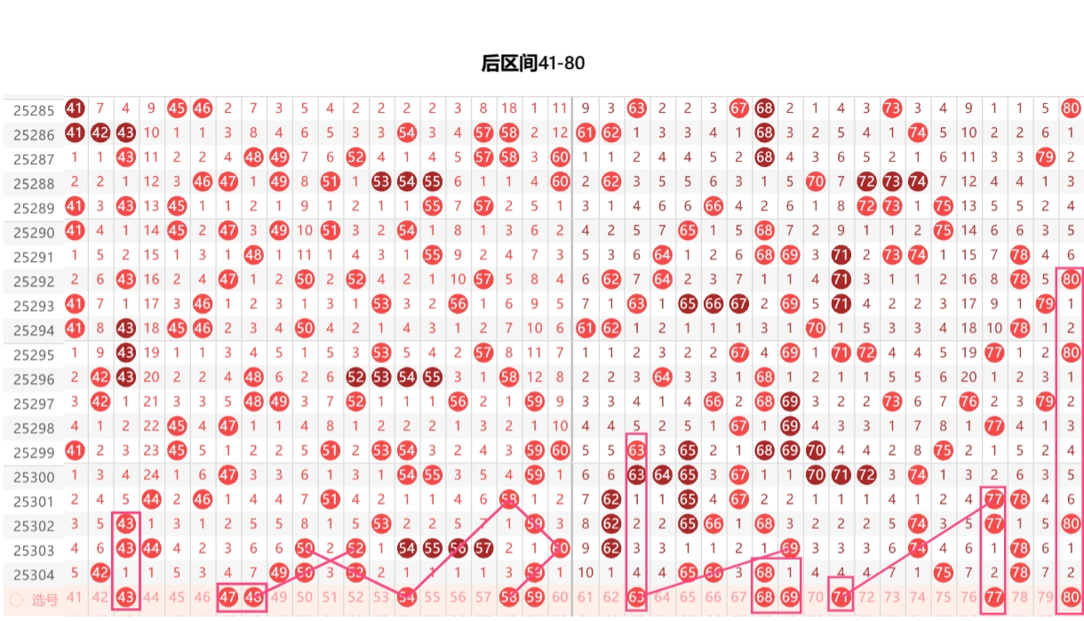 第四小区间,61-80,上期该区间5个号码,本期的走热的几率是比较大的,本期的61 65的组合和65 73的组合开出的几率也是比较大的,本期的79 80的姐妹组合,这里的68 70的组合开出的几率也是比较大的,本期的68 71的组合开出的几率也是比较大的,本期的64 66的组合开出的几率也是比较大的,本期的78 79的姐妹组合开出的几率也是比较大的,本期的73 74 75的三连参考下,本期的63 71的组合和65 73的组合参考下,本期的61 67的组合开出的几率也是比较大的,本期的68 70 72的组合参考下,本期的64 69的组合开出的几率也是比较大的这里的69 71的组合小防一下,本期的63 68的组合开出的几率也是比较大的