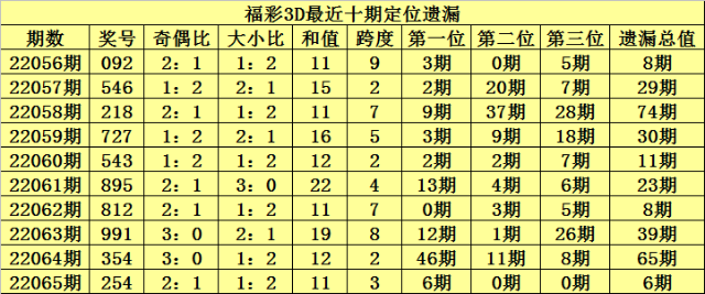 开奖回顾:福彩3D第2022065期奖号:254,百位号码遗漏6期、十位号码遗漏0期、个位号码遗漏0期,遗漏总值为6期。