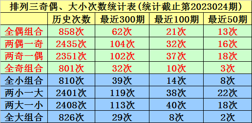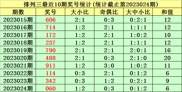 上期回顾:排列三第2023024期奖号为:060。奖号类型:组三,和值:6,奇偶比:0:3,跨度:6,大小比:1:2。