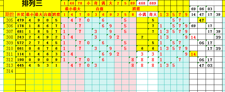 一是把最小与最大号码、合值、跨度进行分类及代码设置; (1)最小最大号码专指一注号码中最小与最大的数字。将 0-9 十个数字分为三组即012-3456-78956;分别用代码1-4-7表示;其中,代码 1 对应数字 012,代码 4 对应3456代码7 对应56789 (2)合值0-9 按奇(13579)偶(02468)小(01234)大(56789)划分 设定0369四个代码。代码 0 对应 0、1、2、3、4(小号),代码 9 对应 5、6、7、8、9(大号),代码3对应13579(奇数),代码6对应02468(偶数); (3)跨度0-9分为三组即234--567-8901,分别用代码258代替,即 代码2 对应 2、3、4,代码 5 对应 5、6、7,代码 8 对应 8、9、0、1。