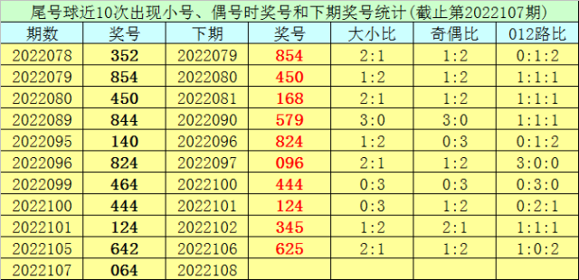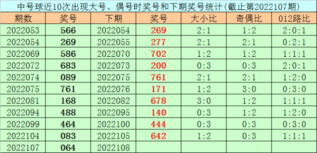 开奖回顾:体彩排列三第2022107期开出奖号064,奖号大小比开出1:2,奇偶比开出0:3,012路比开出2:1:0。