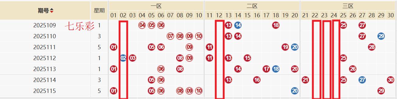 近七期开奖中一区出号数量为3+4+4+3+3+2+6=25枚,整体占比为51%;二区出号数量为2+2+2+3+3+2+0=14枚,整体占比为28.6%;三区出号数量为2+1+1+1+1+3+1=10枚,整体占比为20.4%。一区整体占比过高,呈现上升趋势,鉴于整体波动,本期慎防。二区占比低于均值,呈现下降趋势,鉴于整体波动,本期重点关注。三区占比过低,呈现下降趋势,鉴于整体波动,本期慎防。基于动态平衡干预以及波动趋势衡量,本期七乐彩开奖三区比倾向于2:3:2。重点关注周期遗漏的2,12,22,23,24。