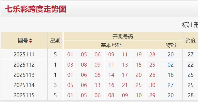 近五期七乐彩开奖号码跨度依次为27→22→25→25→28。周期跨度均值为25。周期跨度振幅为6。周期修正跨度振幅为4。基于动态平衡干预以及波动趋势衡量,本期开奖跨度推测区间为21-29。基于风险对冲策略,本期开奖跨度区间缩水为22-28。