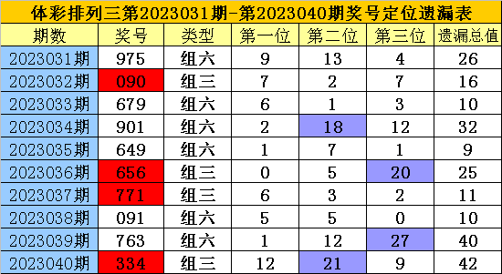 开奖回顾:排列三第2023040期奖号为:334,各位号码遗漏值分别为12、21、9,遗漏总值为42。