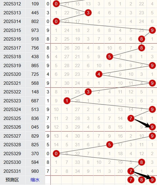 上期跨度为9,近5期跨度开出情况:第25327期开出7,属于奇数,1路号码,火属性;第25328期开出6,属于偶数,0路号码,水属性;第25329期开出7,属于奇数,1路号码,火属性;第25330期开出5,属于奇数,2路号码,土属性;第25331期开出9,属于奇数,0路号码,金属性;