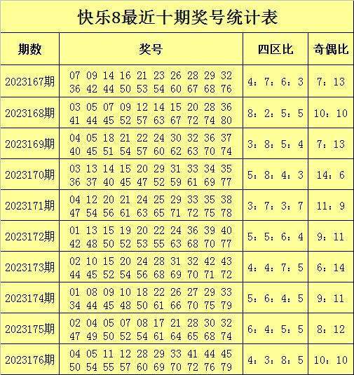 福彩快乐8第2023176期开奖回顾:04 05 11 12 28 29 33 41 44 45 50 54 55 57 60 69 70 72 76 79,其中奖号四区比为4:3:8:5,奇偶比为10:10。