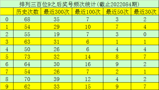 第一位杀号:上期第一位奖号为9,第一位奖号9历史上出现614次,前100次该位开出奖号9之后,下期号码0-9出现次数从高到底分别为:号码6→16次,9→15次,5→14次,8→12次,1→10次,0、2、7→7次,3、4→6次。