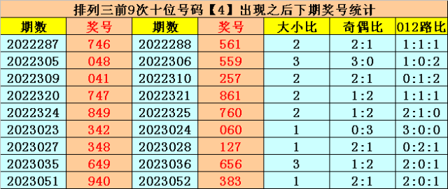 十位号码:十位上期开出偶数、大号、1路号码:4,历史上十位号码4共开出664期,上一次出现在第2023051期,上期奖号遗漏值为2期。