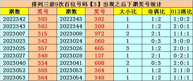 在百位前9次出现号码3之后,下期百位分别开出奖号:3-2-9-0-6-1-6-3-3,其中开出号码个数大小比是3:6,012路比是7:1:1,奇偶比是5:4。