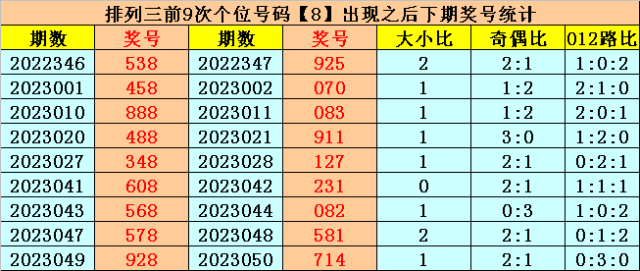 个位前9次开出号码8时,该位下期奖号分别为:5-0-3-1-7-1-2-1-4,其中号码个数奇偶比是6:3,大小比是2:7,012路比是2:5:2。