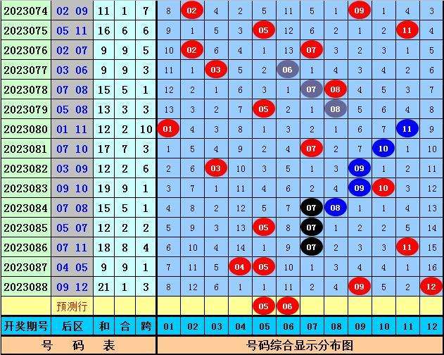 前区和值走势:上期前区和值为84,开出90以下的小和值,最近10期和值大小比为4:6,对比上期,本期预计和值上升,开出大和值,在100左右出现。
