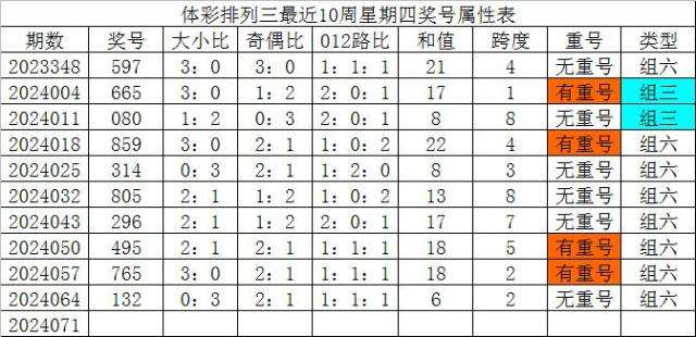体彩排列三最近10周星期四奖号分别为:597、665、080、859、314、805、296、495、765、132,各奖号属性详见下表:
