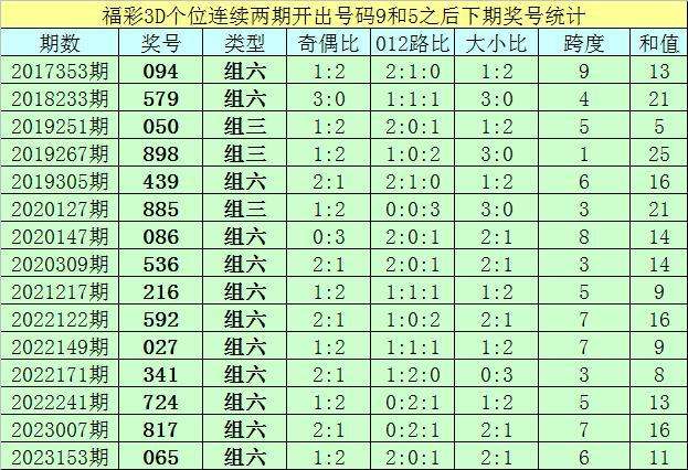 个位号码:最近两期个位开出号码为9-5,在福彩3D历史开奖中,前后两期个位分别开出号码9-5的奖号出现了66次。最近15期个位9-5组合出现之后,其下期奖号分别为:094-579-050-898-439-885-086-536-216-592-027-341-724-817-065;