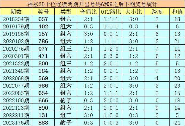 十位号码:前两期十位分别出现奖号6-9,历史上福彩3D连续前后分别开出号码6-9的现象共开出87次。在十位6-9的现象出现时,最近15期其下期分别开出号码:657-402-157-786-077-471-500-184-569-986-654-666-590-131-888;