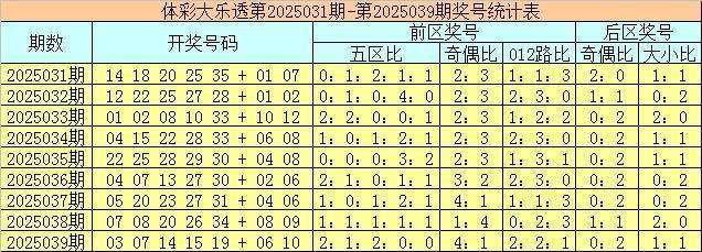 体彩大乐透第2025039期奖号为03 07 14 15 19 + 06 10,前区号码五区比为2:1:2:0:0,奇偶比为4:1,012路比为2:2:1,后区号码奇偶比为0:2,大小比为1:1。